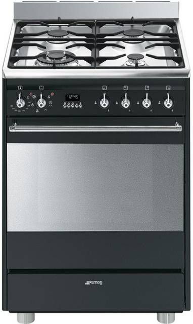 Dit vrijstaande Smeg SNLK61MA9 gasfornuis in zwart, met energielabel A, heeft 4 gasbranders en een hetelucht-oven met een inhoud van 70 liter. De Multifunctionele oven heeft 7 functies. Bij dit fornuis wordt een wokring meegeleverd. De specifieke Vapor Clean functie vergemakkelijkt het reinigen en onderhoud van de oven. Op de bodem van de oven bevindt zich de speciale Vapor Clean cirkel. Wanneer hier water in wordt gedaan en het Vapor Clean programma wordt geselecteerd, zal de oven het water omzetten in stoom, waardoor het vuil in de oven wordt los gestoomd. Hierdoor wordt het reinigen van de oven aanzienlijk vergemakkelijkt.Gaskookplaat:- 4 gasbranders-1 wokbrander linksvoor 3.5 kW- 2 normale branders rechts- en linksachter 1.80 kW- 1 kleine brander rechtsvoor 1.00 kW- Grill element: 1,70 kW- Elektronische vonkontsteking in de knoppen- Thermobeveiliging- Gietijzeren pannendragers- Vangschaal één geheelOven:- 7 functies- Onder en bovenwarmte- Onderwarmte- Luchtcirculatie met grote vlakgrill- Grote vlakgrill- Luchtcirculatie met onderwarmte- Hete lucht multifunctioneel Vapor Clean functie- Timer en automatische in- en uitschakeling- Temperatuur instelbaar van 50° 260°C- Mantelkoeleing- Uitneembare ovendeur, dubbel glas- Binnenzijde oven voorzien met Ever Clean emailleAfmetingen (hxbxd) 87,5-93x60x60cm.