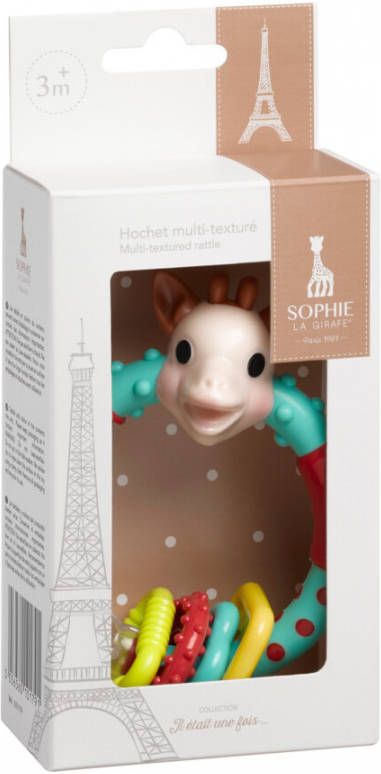 Sophie de Giraf Multi-textuur RammelaarOm te ontdekken: levendige kleuren die de aandacht van baby trekken, gedeeltes met verschillende texturen om op te bijten, 4 vormpjes om heen en weer te schuiven, gekleurde balletjes om te schudden en te luisteren hoe alles klinkt. Verpakt in een mooi geschenkdoosje, leuk als kadootje! * Makkelijk vast te houden dankzij de ringvorm * Leeftijd: vanaf 3 maanden * Afmeting: 13,5 x 9 x 5,3 cm * Verpakking: in wit geschenkdoosje.