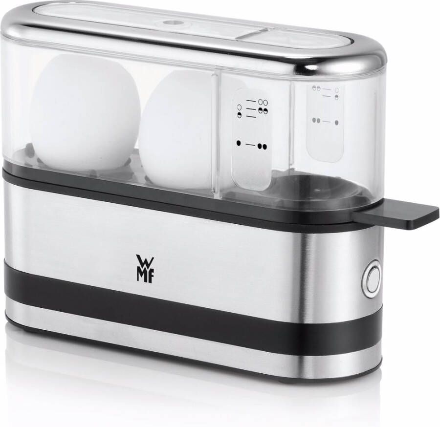 Met deze gemakkelijk te reinigen roestvrijstalen eierkoker van WMF kun je 1-2 eieren van maat S-XL koken. Het apparaat is vormgegeven met een transparante deksel en een geïntegreerde waterdispenser.
