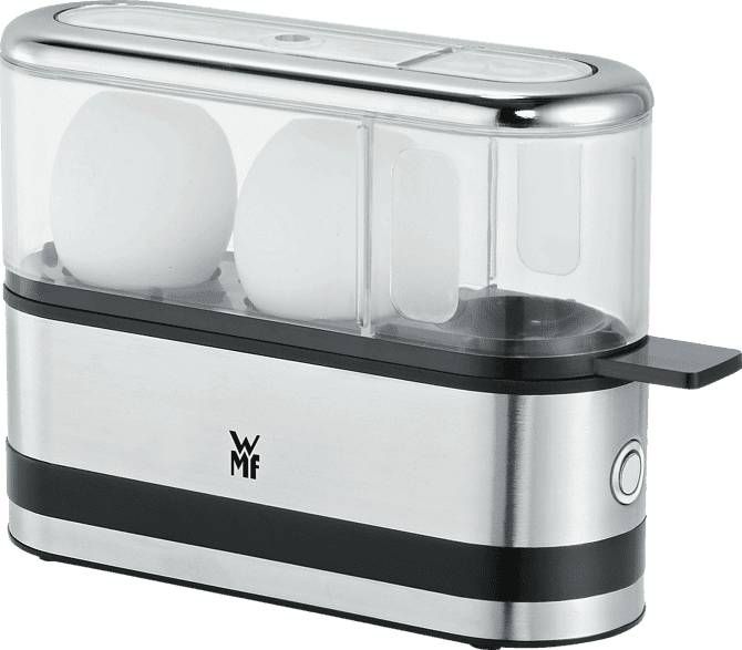 Deze mini eierkoker van WMF kan tot twee eieren tegelijk koken in de gewenste mate van hardheid. Het herinnert je eraan dat de gewenste hardheid is bereikt met een zoemtoon.